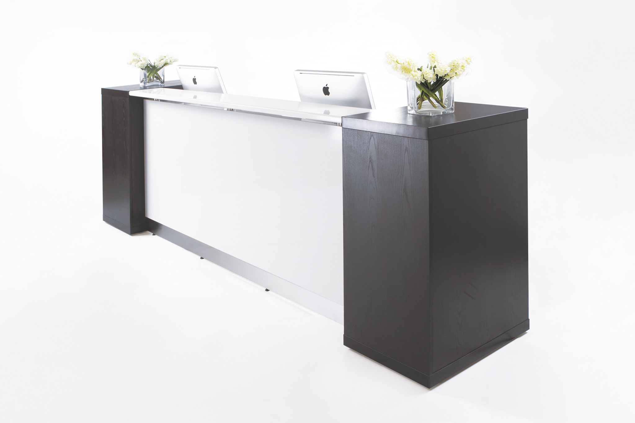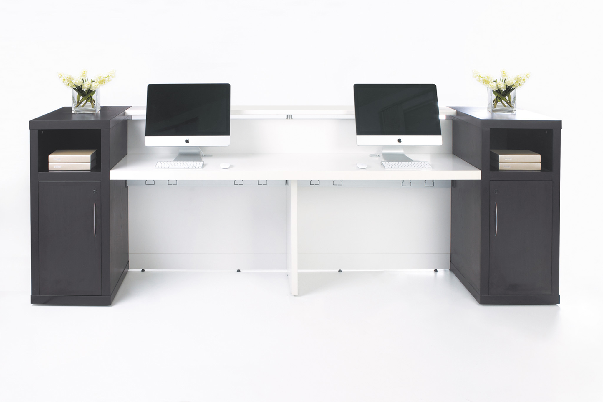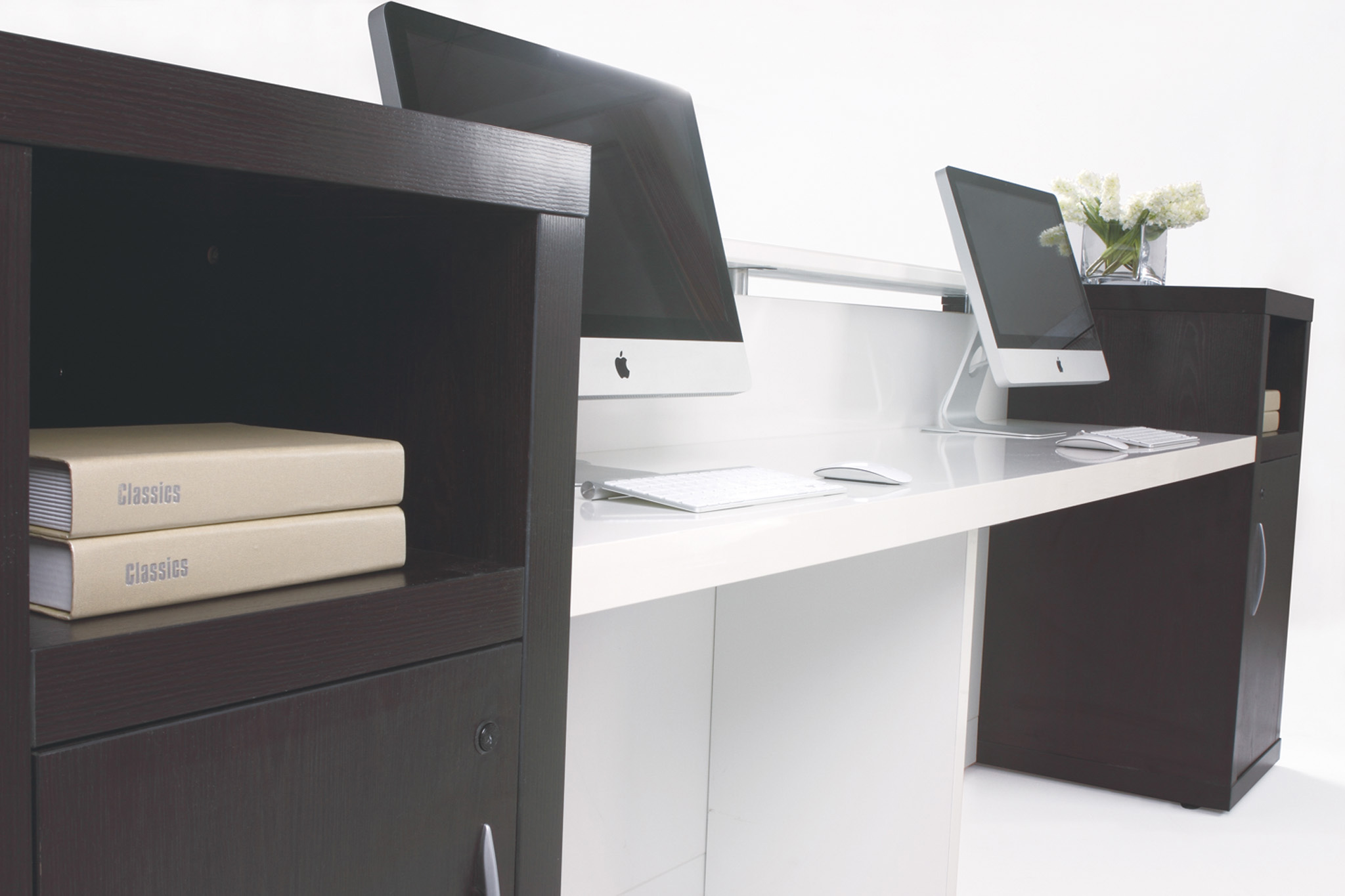 Aston Reception Counter provides sophisticated and versatile with ample storage space. Front panel in white with a lockable side storage cupboard unit with book shelf on each side in regal walnut. Hob in jade white stone supported on chrome pillars, desktop in gloss white and an stainless steel kick plate.