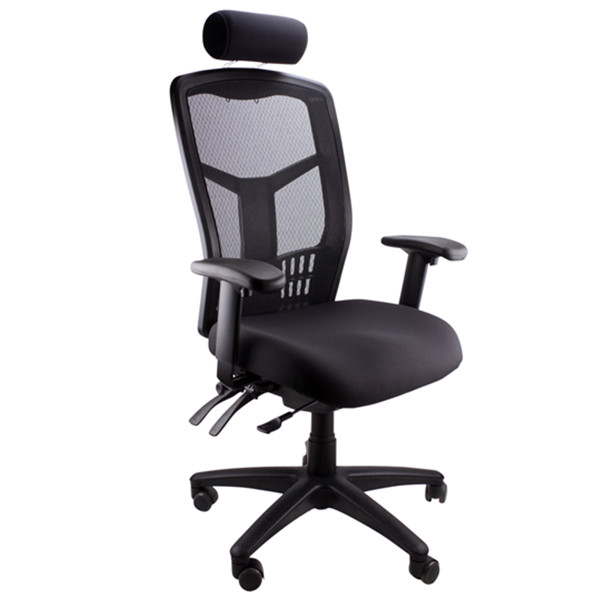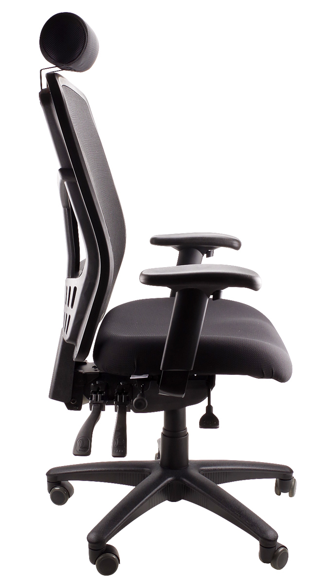 Mesh back fully ergonomic chair with fabric seat and adjustable armrests.