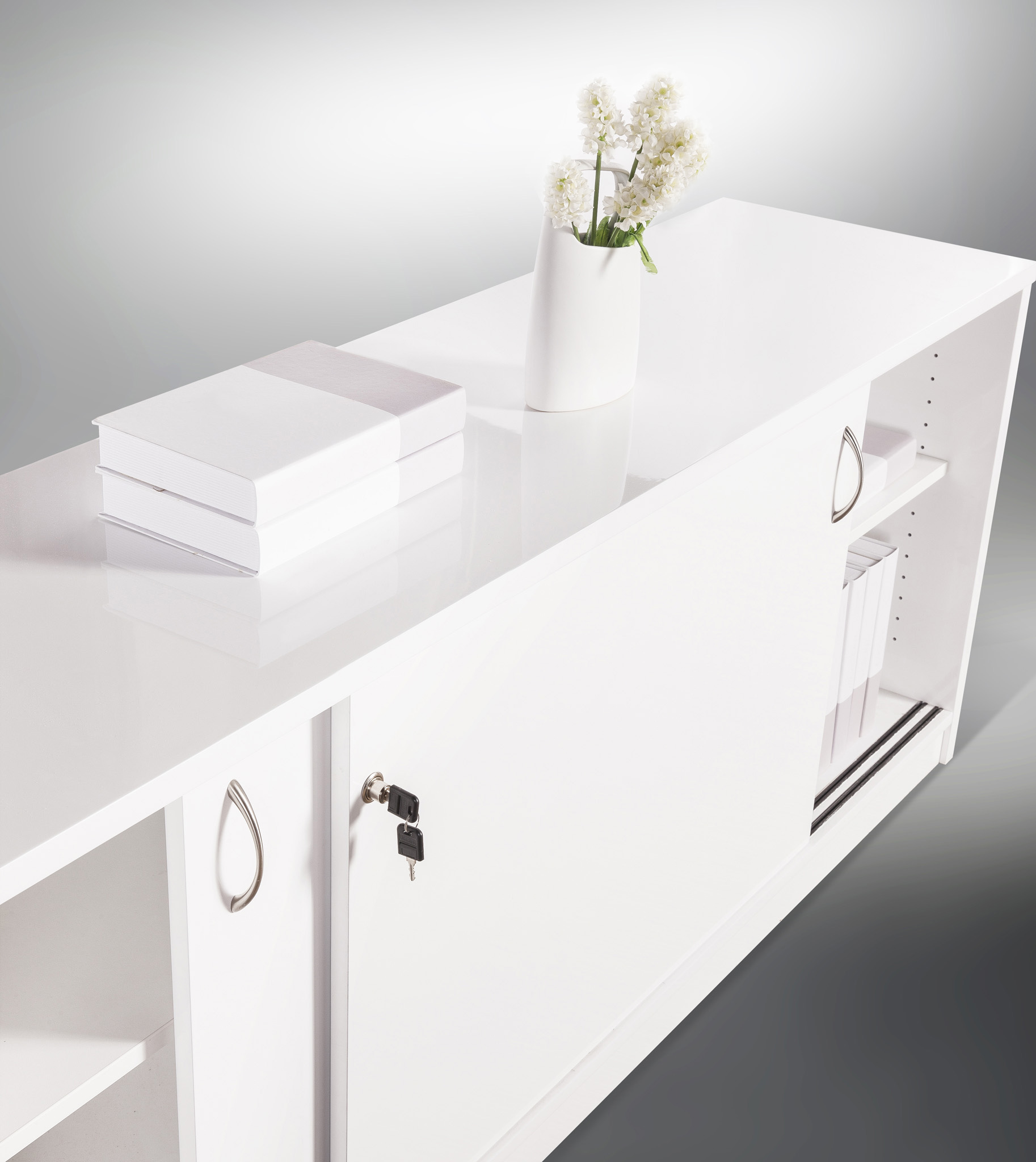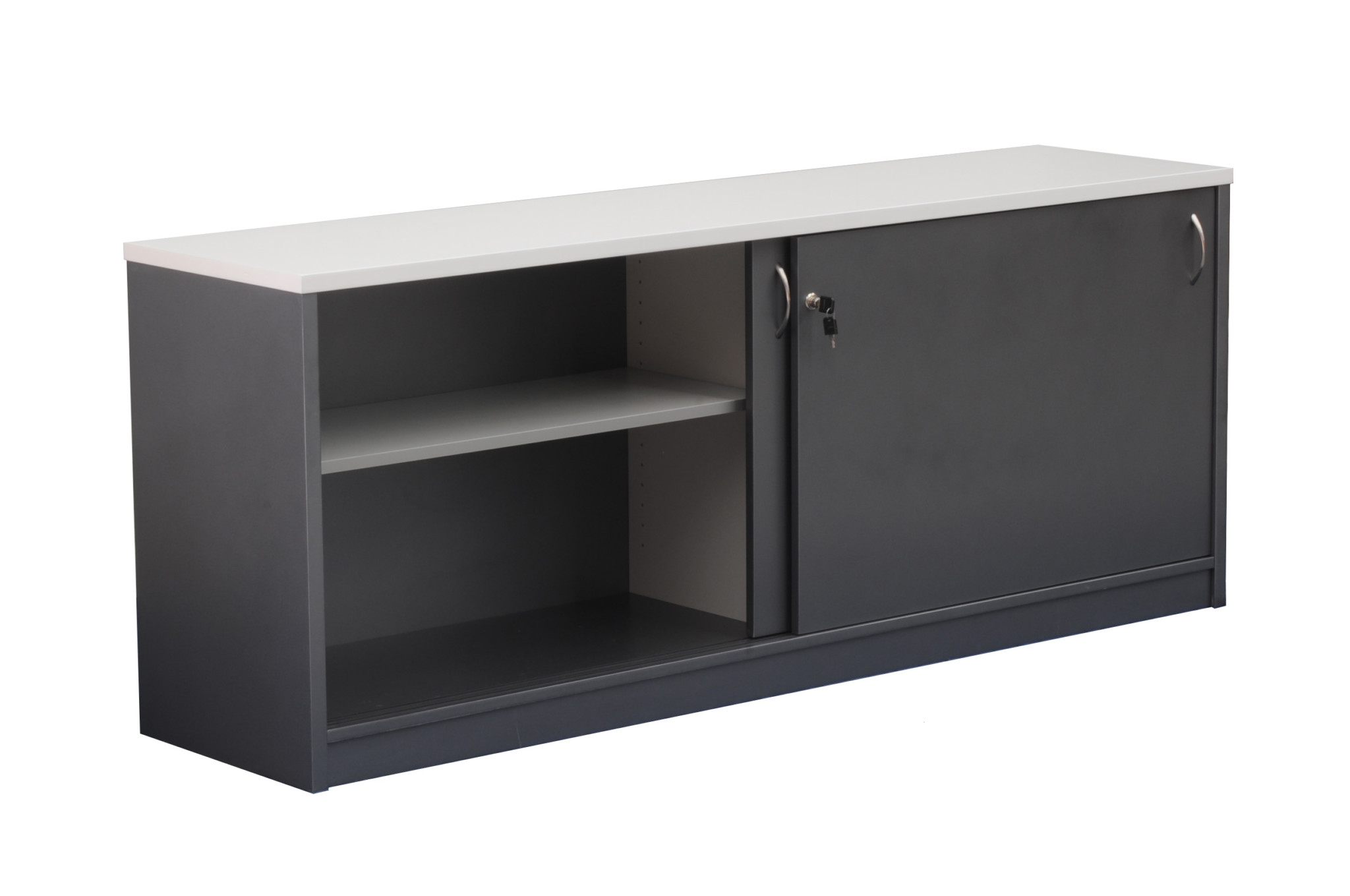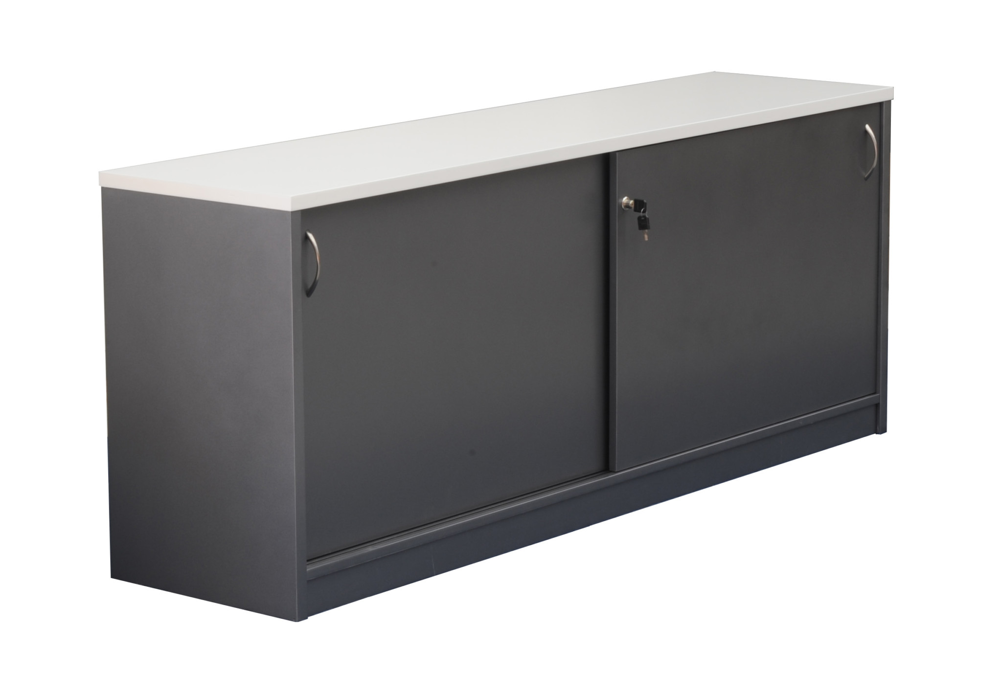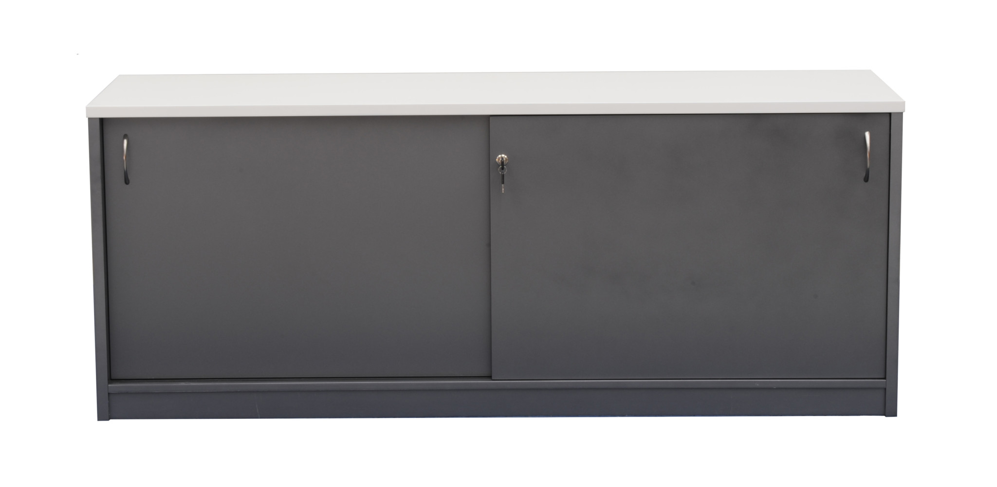 Two sliding lockable doors with chrome handles.
