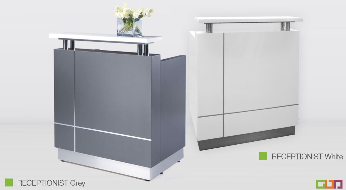 Elegant and versatile. Ideal for retailers. Teak desktop with two lockable drawers. Jade white stone hob and stainless steel kick plate for added style. Counter body available in 2 colours; metallic grey or high gloss white with feature aluminium strips.